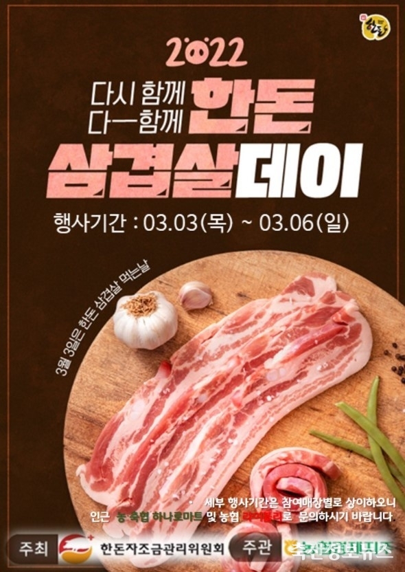 농협(회장 이성희) 축산경제는 한돈자조금관리위원회와 함께 3월 3일 삼겹살데이를 맞아 농협 한돈 소비촉진을 위한 할인행사를 온라인 및 오프라인 매장에서 다양하게 진행한다.