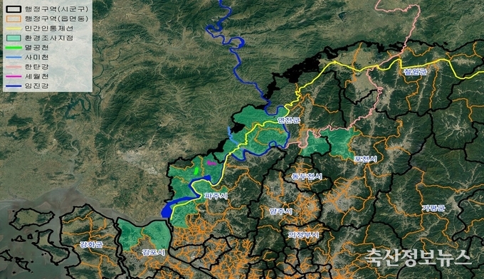 바이러스 조사 대상지는 임진강과 한탄강으로 합류되는 민통선 내 소하천이 있는 파주, 연천 등 접경지와 돼지 사육농장*이 많이 분포하는 김포, 포천 등 경기 북부지역이다.