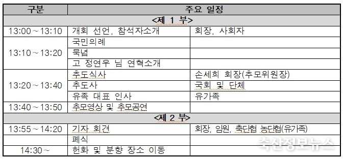 추모제에는 대한한돈협회 및 축산관련단체협의회 소속 농가 등 300여 명이 참석해 애도의 뜻을 함께할 예정이며, 손세희 회장의 인사말과 약력 소개, 추모사, 기자회견, 헌화 순으로 진행된다.