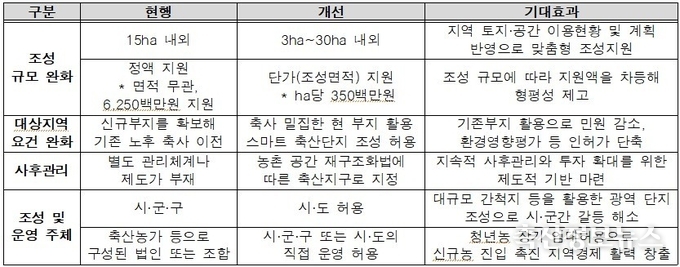 주요 개편내용은 다음과 같다. 먼저 지능형(스마트) 축산단지 조성 규모를 15ha 내외에서 3ha 이상으로 완화하여 농촌지역 토지이용현황과 공간 활용 계획 등을 반영할 수 있도록 하였다. 이를 통해 조성사업의 주체인 시·군은 활용 가치가 높지 않은 외곽지역 3ha 규모의 협소한 토지 등도 사업 부지로 활용할 수 있게 되었다.