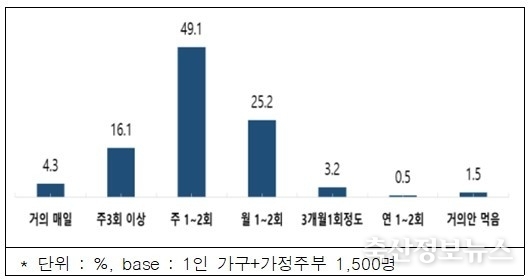 돼지고기는 일주일에 1번 이상 먹는 소비자가 69.5%에 이르고, 주 3회 이상 먹는 소비자가 20.4%, 주 1∼2회는 49.1%, 월 1∼2회 25.2%, 3개월에 1회 또는 그 이하는 5.3%로 나타났다.