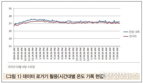 또한 위치에 따른 온도 변화 확인이 가능(2채널 4채널)한 것은 물론 내·외부(복도, 돈방, 입기구) 등의 온도도 확인할 수 있다. 반면 데이터 로거기의 가격이 비싸(20~40만원 수준)고 모든 돈사에 설치하는 것은 무리로 문제가 있는 돈사에 2~3일간 설치 후 데이터 분석으로 활용한다.