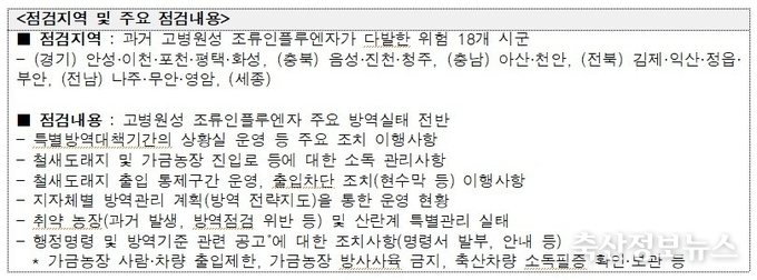 이번 점검은 지난 9월 12일 경기도 파주에서 과거보다 다소 이른 시기에 고병원성 조류인플루엔자가 가금농장에서 발생하였고, 10월부터 겨울 철새가 본격 도래하면서 국내 추가 발생 가능성이 커짐에 따라 선제적으로 농식품부, 행정안전부, 농림축산검역본부, 시도 관계관 합동으로 점검반을 구성하여 실시하는 것이다.