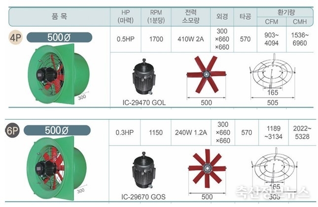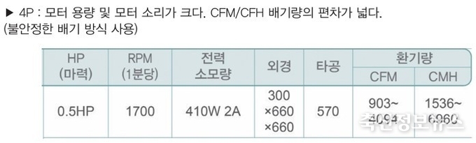 ▶ 4P : 모터 용량 및 모터 소리가 크다. CFM/CFH 배기량의 편차가 넓다.