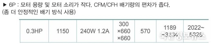 ▶ 6P : 모터 용량 및 모터 소리가 작다. CFM/CFH 배기량의 편차가 좁다.