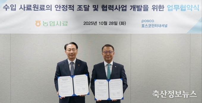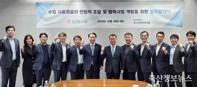 농협사료는 지난 10월 28일 서울 포스코센터에서 정종대 대표이사와 임재성 포스코인터내셔널 소재바이오본부장 등이 참석한 가운데 전략적 업무협약(MOU)을 체결했다고 밝혔다. 이번 협약은 2022년 11월 첫 협약을 시작으로 4년째 이어지고 있으며 미중 무역갈등 등 글로벌 곡물 시장의 불확실성이 지속되는 가운데 국내 기업 간의 협력을 통해 원료의 안정적 확보 및 축산농가 경쟁력 강화라는 공동의 목표를 담고 있다.