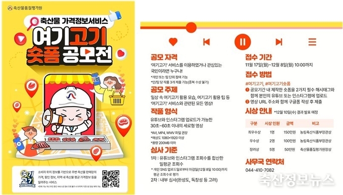 축산물품질평가원(원장 박병홍)이 11월 17일부터 12월 8일까지 국민이 쉽고 재미있게 ‘여기고기’ 서비스를 접할 수 있도록 쇼트폼 공모전을 개최한다. ‘여기고기’는 소비자 주변 축산물 판매장 가격과 지역 평균 시세를 한눈에 보여주는 위치 기반 축산물 가격정보 서비스다.