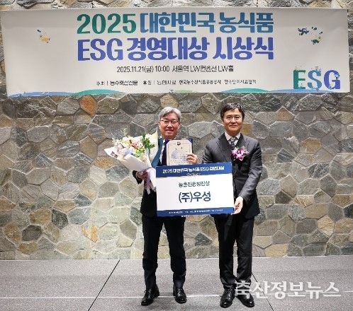 ㈜우성(대표이사 한재규)은 지난 11월 21일 농림축산식품부와 농촌진흥청이 후원하고 농수축산신문이 주최·주관한 ‘2025 대한민국 농식품 ESG 경영대상’에서 최우수상(농촌진흥청장상)을 수상했다고 밝혔다.