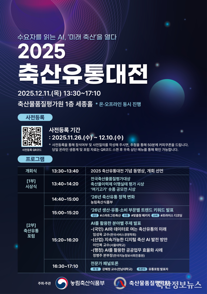 농림축산식품부(장관 송미령)가 주최하고 축산물품질평가원(원장 박병홍)이 주관하는 ‘2025 축산유통대전’이 12월 11일 세종시 축산물품질평가원 본원에서 열린다. 이번 행사는 올 한해 축산업계를 돌아보고 2026년을 전망하기 위해 마련됐으며, 온오프라인에서 동시 진행된다.