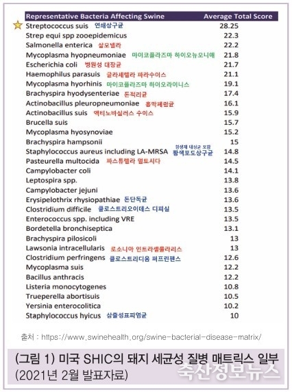이러한 취지에서 양돈 선진국 중 하나인 미국의 ‘Swine Health Information Center(돼지건강정보센터, SHIC)’의 Swine Bacterial Disease Matrix(돼지 세균성 질병 매트릭스, 그림 1)를 한번 살펴보고자 한다. SHIC는 미국 pork checkoff(돼지고기 자조금)을 통해 출범한 기구로 여러 양돈 질병 자료들을 정리하여 자국 내 양돈농가에 제공하고 있다. 본 매트릭스는 다양한 세균성 병원체를 ①인수공통전염병 가능성, ②생물보안 및 병원체 관리 방법, ③병원체의 확진을 위한 진단 및 분리 정도, ④동물복지 측면 및 ⑤양돈시장의 영향성 등의 기준에서 점수를 부여하고 합산하여 순위를 낸 자료이다. 최근 자료는 2021년 2월에 산정한 내용으로 (그림 1)은 이중 순위가 높은 순서의 병원체 일부를 발췌한 것이다.