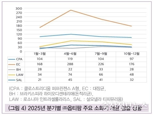 작년 분기별 병원체의 검출 정도는 돈적리균을 제외한 나머지 균이 기온이 점차 상승하는 봄철과 초여름 시기에 상대적으로 많았다. 절대적인 수준은 아니지만, 일반적으로 세균성 소화기 질병은 여름철에 보다 호발하고 세균성 호흡기 질병은 가을철과 겨울철에 증가하는 경향을 보이고 있음을 작년 ㈜옵티팜의 병원체 검출 상황에서도 보여주고 있다.