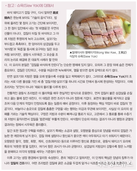 말레이시아의 슈욕(Siew Yok)과 태국의 무껍(Moo Krob)은 뿌리는 같지만, 조리법에서 미세한 변주를 주며 삼겹살을 ‘요리’의 반열에 올렸다.