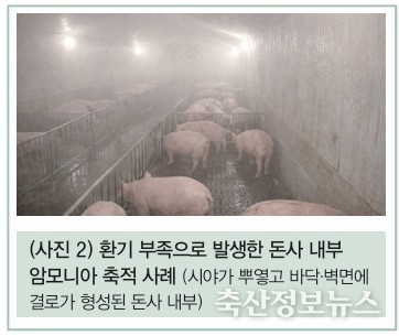 ② 유해가스 축적 : 환기량이 부족할 경우 암모니아와 이산화탄소가 빠르게 축적된다. 암모니아는 호흡기 점막을 직접 자극하여 염증 반응을 유발하고, 이산화탄소 농도 증가는 산소 이용 효율을 저하해 돼지의 전반적인 활력을 떨어뜨린다.