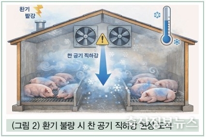 ④ 찬 공기의 직접 유입(국소 한랭 스트레스) : 환기구 조절이 미흡할 경우 외기가 돼지 체표에 직접 도달하게 되며, 특히 자돈 구간에서는 체온 저하와 면역력 감소가 빠르게 진행된다.