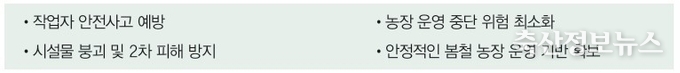 ② 시설물 보강 및 유지관리 : 기초부·벽체 균열 즉시 보수 / 노후 지붕 및 구조물 보강 / 임시 지지대 설치로 붕괴 예방