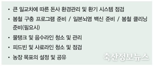 겨울에서 봄으로 넘어가는 환절기에는 겨울철 내내 유지했던 최소 환기량을 점점 증가시켜 주는 시기이다. 따라서 이 시기에는 환기량의 증가로 인해 돈사 내에 급격한 환경 변화가 일어날 수 있다. 따라서 돈사 내 온도의 변화가 급변하지 않도록 외부 온도 파악과 더불어 돈사 내 온도 관리를 철저히 해야 한다. 특히 자돈사의 경우 이유 직후 온도 변화를 최소화하는 것에 주안점을 두고 관리해야 한다. 면역력이 약한 이유자돈은 일교차에 민감하게 반응하기 때문에 돈사 내에서 일교차를 4~5도 이상 차이가 나지 않도록 관리해 큰 온도 차이로 인한 질병을 예방해야 한다.