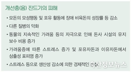 구충하지 않는 농장의 경우 호흡기 질병에 취약하고 면역력 저하, 증체율 저하, 출하지연, 사료효율 저하 등의 피해가 발생한다. 또한 외부 기생충인 개선충(옴)에 감염이 되면 극심한 가려움증에 의한 상처, 소양감에 따른 스트레스, 가려움을 해소하는 행동(굶는 행동)에 따른 돈사 시설의 훼손 등이 발생한다. 특히 분만사에서 이러한 스트레스 상황은 모돈의 모성행동 및 포유 활동에 방해를 준다. 따라서 분만사 이동 전에 옴에 대한 대책을 마련하는 것은 아주 중요하다.