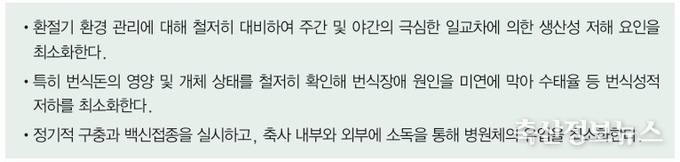 다만 일교차가 커지는 시기이기 때문에 모돈이 체온유지에 많은 에너지를 소모할 수 있다. 이러한 상황을 고려해 사료 조정을 해야 하며, 이러한 변화를 최소화하기 위해 돈사 온도 등 환경 관리에 중점을 두어 관리해야 한다.