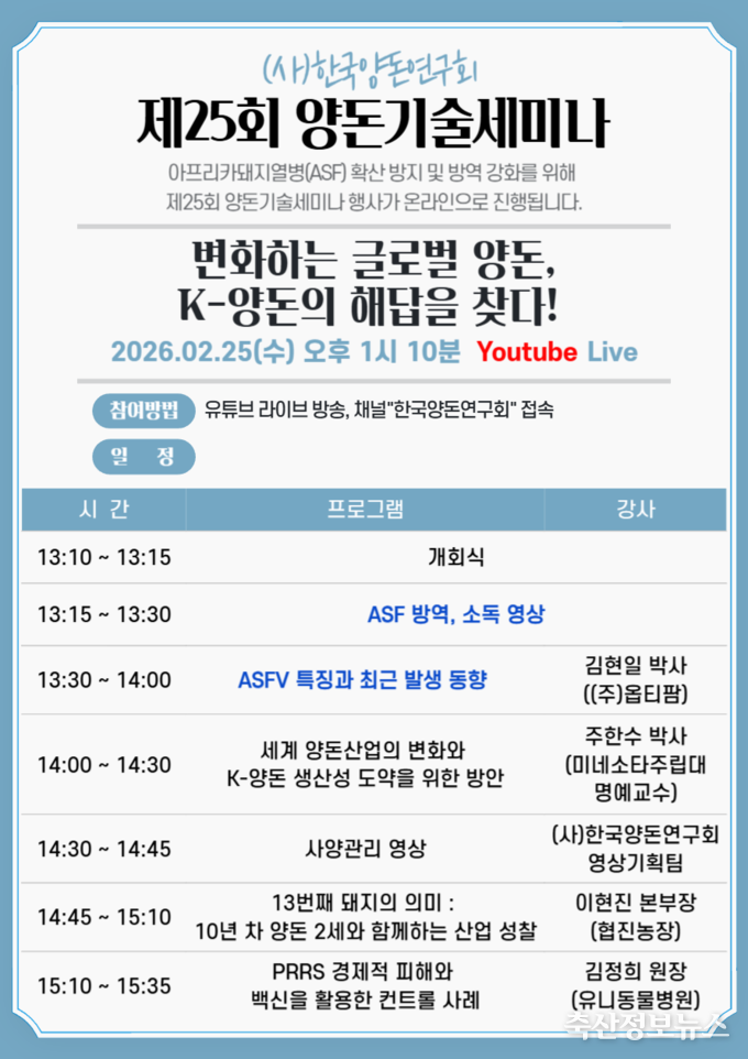 한편 정기총회는 2월 25일 오전 11시 ZOOM 화상회의(회의 아이디 285 678 2493 / 비밀번호 1234), 이어 제25회 양돈기술 세미나는 2월 25일 오후 1시 10분 유튜브 라이브 방송(채널: 한국양돈연구회 접속)으로 진행한다.