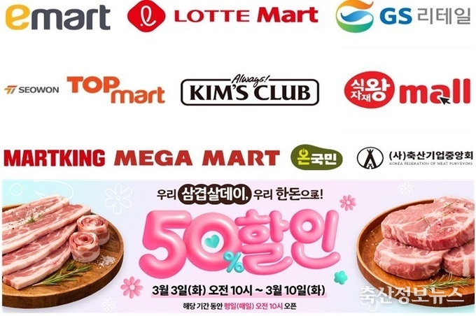 전국 대형마트도 삼겹살데이에 맞춰 할인 대열에 합류한다. 이마트, 롯데마트, GS리테일, 킴스클럽, 탑마트 등 주요 유통사에서는 한돈 삼겹살과 목살을 최대 50% 이상 할인 판매하며, 농협 하나로마트와 라이블리에서도 최대 52% 할인된 가격으로 우리돼지 한돈을 만나볼 수 있다.