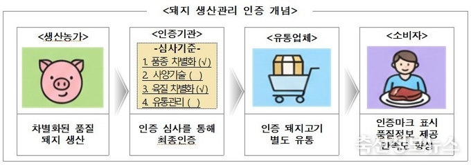농림축산식품부(장관 송미령)는 돼지고기 육질 차별화를 통한 소비자 선택권을 확대하기 위해 생산단계에서 품종과 사육방식이 특화된 농장을 대상으로 ‘돼지 생산관리 인증’을 2026년부터 시범운영 한다고 밝혔다.