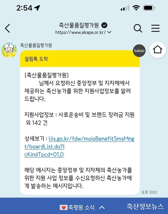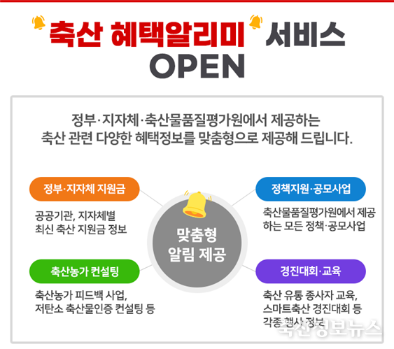 축산물품질평가원(원장 박병홍)은 지난 3월 9일 축산농가와 이해관계자가 정부·지자체 지원사업 및 축산 관련 안내 등의 정보를 맞춤형으로 받아볼 수 있는 ‘축산 혜택알리미’ 서비스를 본격 개시했다.