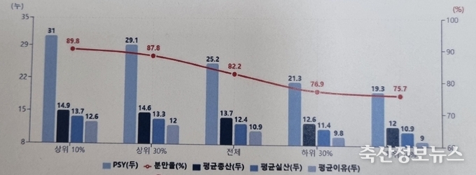 안기홍 박사는 2025 피그플랜 사용 470호 농가(모돈 사육규모 23.3만두)의 양돈 생산성 분석 발표를 통해 상하위 그룹별 주요 생산성적을 비교한 결과 상위 10% 농가의 PSY는 31두로 유럽 선진국 수준에 근접한 것으로 분석되었다고 밝혔다. 반면 상하위 30% 농장간 분만율은 10.9%, 7일 내 발정재귀율은 5.1%, 비생산일수는 29일, 모돈 회전율은 0.2, 평균 총산자수는 2두, 평균 실산자수는 1.9두, 평균 이유두수는 2.2두, PSY는 7.8두의 차이가 각각 나타났다.