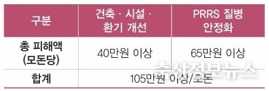 한돈미래연구소의 2024년 전국 평균 성적(PSY 22.3두, MSY 18.9두)과 비교하면, 총 피해액은 모돈당 105만원 이상으로 추정된다. 이 중 건축·시설·환기 개선으로 줄일 수 있는 부분과 PRRS 질병 안정화로 개선 가능한 부분을 구분하면 다음과 같다.