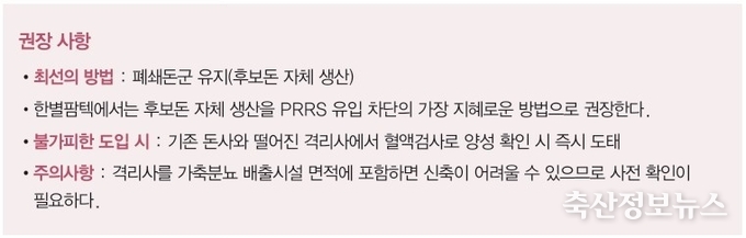 대책 : PRRS 유입 시 모돈당 105만원 이상의 피해가 발생할 수 있다. 그러므로 안전화와 전기 연장선 등은 농장에서 미리 준비하여 제공하고, 타 농장에서 사용하던 오염 위험 물품은 농장 내로 반입하지 않도록 한다.