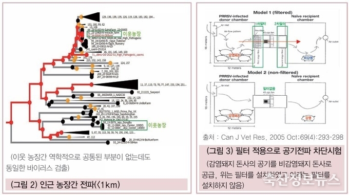 이웃 농장과의 거리가 1km 이내일 경우 공기를 통한 바이러스 전파 가능성이 있다. 역학적으로 공통된 부분이 없는데도 동일한 바이러스가 검출되는 사례가 이를 뒷받침한다.