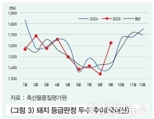 올 한 해도 정부를 필두로 생산자를 비롯한 여러 기관, 많은 사람이 안전하고 품질 좋은 돼지고기 생산을 위해, 수급 안정을 위해, 그리고 ASF 등 가축 질병 발생·확산 방지를 위해 노력했다. 그중 축산물품질평가원은 품질평가·이력관리·스마트 축산 지원뿐만 아니라, 고유업무 수행을 통해 수집된 유통단계별 데이터를 분석하여 생산자, 유통인, 소비자의 삶에 도움이 되고자 노력했다. 이제 얼마 남지 않은 2025년을 마무리하며, 올해의 돼지고기 유통시장은 어떠했는지 데이터를 기반으로 정리해 보고자 한다. 1. 국내 경기 지표 및 시장 동향 가. 국내 경기 지표 가계 생활형편전망 CSI는 7월 101로 6월에 이어 100을 상회했다. 가계 외식비 지출전망도 회복세를 보이며, 소득 500만원 이상 가계의 경우 2달 연속 100을 상회했다. 민생 회복소비 쿠폰 지급 등의 영향으로 보인다. 나. 시장 동향 2025년 돼지고기 지육 도매시장 경락가격과 마트의 소비자 가격은 과거 대비 높은 수준을 유지했다. 이는 육류 내 대체 소비 수요, 국내산 돼지고기 공급량 감소 및 수입 물량 감소 등의 영향으로 판단된다. 내수 부진으로 가정 내 소비가 증가했고, 2분기부터 나들이 수요