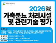 축산정보뉴스 안영태 기자 | 축산환경관리원(원장 문홍길)은 지난 3월 27일부터 5월 26일까지 ‘2026년 가축분뇨 처리시설 및 관련기술 평가 계획’을 공고하고, 신청접수는 4월 27일부터 진행한다고 밝혔다. 이번 평가는 서류, 현장, 발표 및 종합평가 순으로 진행되며 기업 역량, 기술 우수성 및 경제성 등을 종합적으로 평가할 계획이다. 종합점수가 70점 이상인 업체의 기술정보는 축산환경관리원 누리집을 통해 정보를 공개하며, 책자로 인쇄되어 지자체, 생산자 단체 및 축산업 종사자 등에게 배포될 예정이다. 평가대상은 ‘공동 및 개별규모 가축분뇨 처리시설’과 ‘가축분뇨 처리기술’, ‘악취저감 및 제어기술’ 및 ‘악취측정 ICT 기계·장비’ 관련기술이다. 이번 평가에서 악취측정 ICT 기계·장비 평가는 기존 평가 대비 측정데이터 신뢰성 및 안정성 확보, ICT 측정장비 내구성 확보, 경제성 등이 평가될 수 있도록 평가 항목을 개정하여 평가 배점을 조정하였다. 특히 올해는 우수한 기술을 보유하고 있는 많은 업체의 참가 독려를 위해 업체를 직접 방문하는 등 사전 홍보를 하였다. 공고 세부사항은 축산환경관리원 누리집(www.lemi.or.kr) - 알림 소식(공지사항