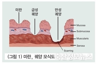 양돈장의 혹서기 환기관리는 어떤 면에선 단순하다 할 수 있다. 온종일 덥고 습하기 때문에 관리자는 그저 돼지가 시원하게 지낼 수 있게 최선을 다하면 된다. 그런데 올해 혹서기는 (그림 1)과 같이 조금 다이나믹한 변화가 있었다. 그러다 보니 필자의 거래처 중 몇몇 농장은 환기관리 실패를 경험하였는데 (그림 1)의 A, B시기에 임신 사고(재발, 공태, 유산 등)가 많았다. 그런데 번식 관련 질병이나 사양관리에는 별다른 문제가 확인되지 않았다. 그래서 필자는 저 시기의 큰 기온 차에 따른 스트레스가 임신 사고를 일으킨 것으로 추정한다. 이러한 일을 겪고 난 후 필자는 자연스럽게 다음과 같은 걱정을 시작했다. “올해는 한여름에도 온도 변화에 따른 사고가 발생했는데 앞으로 다가올 환절기에는 어떤 문제가 우리를 괴롭힐까?” 여름에서 가을로 넘어가는 환절기에 건강해 보이는 육성·비육돈이 급사하면 대부분 호흡기 질병부터 의심한다. 그런데 최근 몇 년간 가을철에 위궤양으로 인한 폐사가 급증하는 경향이 있다. 이는 갈수록 길어지는 혹서기의 데미지가 가을철까지 이어져서 생기는 현상일 것이다. 1. 위궤양이란 위궤양은 위가 손상되어 움푹 파이는 것을 말한다. 위벽 점막 부분만