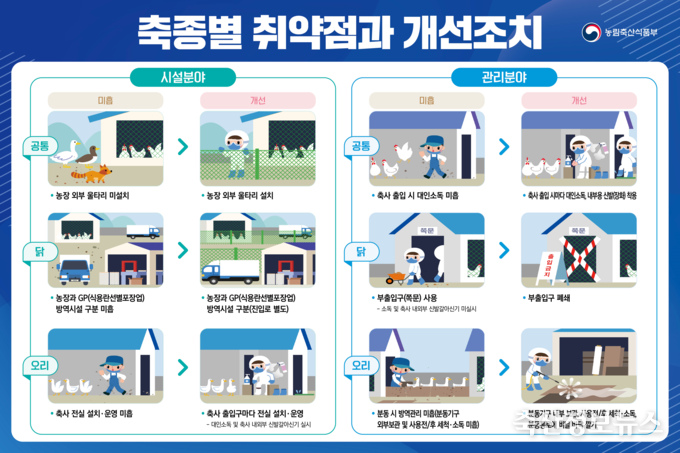 농식품부는 검역본부·지자체․생산자단체와 가금농장을 대상으로 현장방문·전화예찰·문자메시지 등 다양한 수단을 활용해 방역 수칙을 주기적으로 홍보하고 교육해 나갈 방침이다.