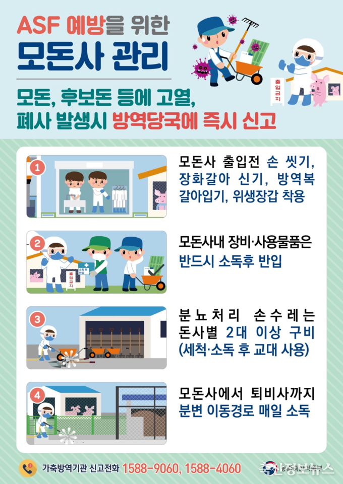 이번 발생 농가도 어미돼지에서 발생한 만큼 모돈사(어미돼지 축사) 관리에 대한 축사 출입 전 전실에서 손 소독․장화 갈아신기 등 기본 방역수칙을 철저히 준수할 것을 당부하였다.
