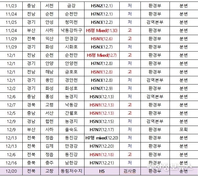 고병원성 조류인플루엔자 발생·검출 세부 현황