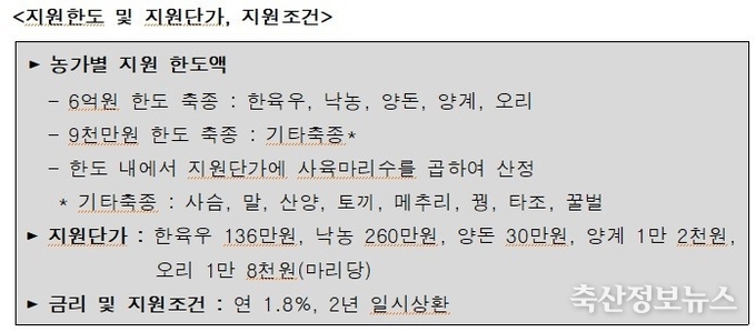 지원한도는 한육우, 낙농, 양돈, 양계, 오리의 경우 6억원, 사슴, 말, 산양, 꿀벌 등 기타 가축은 9천만원 범위 내에서 지원하며, 지원조건은 융자 100%에 금리 1.8%, 2년 일시 상환이다.