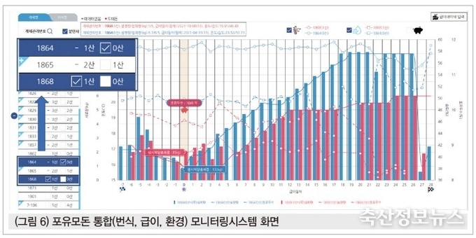 이 프로그램은 피그플랜, 한돈팜스 등 기존의 모돈 개체별 번식관리(발정, 교배, 분만, 이유, 산차, 실산자수, 포유자돈수, 사육일(주)령)기능에 환경관리데이터(온도, 습도), 급이 데이터(급이량, 설정량, 급이 회차) 등 ICT 데이터의 통합관리 기능을 갖춘 프로그램으로 ‘환경에 따른 산차별, 포유자돈수별 급이량 설정 및 섭취량 분석이 가능하다.