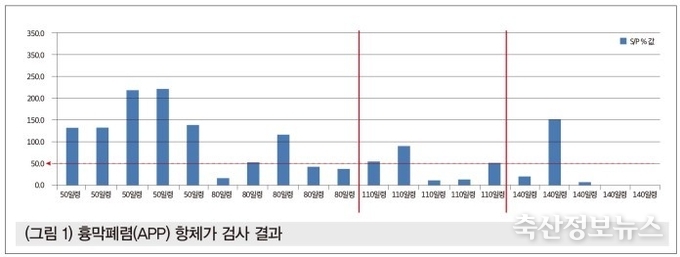 모돈 300두 규모의 일괄 사육하는 농장으로 정기 호흡기 스크리닝 검사 항목 중 흉막폐렴 항체가 검사 결과이다. 항체가 검사 시 110일령 및 140일령 항체 양성으로(80일령 이전 항체는 모체이행항체) 육성·비육구간에서 흄막폐렴으로 인한 피해가 예상되었다. 현재 흉막폐렴 백신은 하지 않고 있었던 상황이라 농장주에게 그간 상황에 관해 물어보니 비육돈에서 급폐사가 종종 발생하나 빈도가 높지 않아 부검 의뢰를 하지 않았던 상황이다.