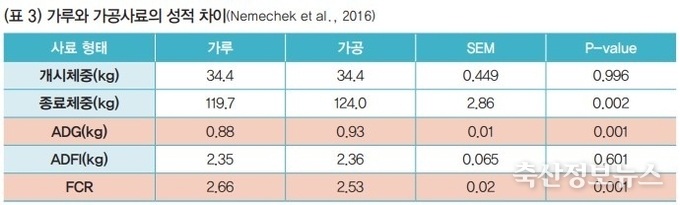 하지만 양돈선진국은 모두 펠릿 등의 가공사료를 전 구간에 사용하고 있다. 이유는 가루 사료보다 가공사료가 FCR 개선 효과가 크기 때문이다. 가루와 가공사료의 성적 차이(표 3) 실험 결과를 보면 사료 형태의 차이에 의해 FCR이 각각 가루사료 2.66에서 가공사료 2.53으로 FCR이 약 0.13p나 감소하였다.