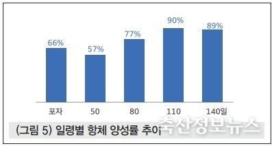일령별 항원타입 추이 분석 시 이전에는 일부 혼합형도 검출되었으나 2023년은 북미형 항원이 76%, 유럽형 항원이 24% 비율로 나타났다. 북미형 항원의 경우 포유자돈 구간을 고점으로 110일령 전후까지는 일령이 증가할수록 출현율이 감소하는데, 140일령 이후에서는 유럽형만 나타났고 북미형 항원은 나타나지 않았다.