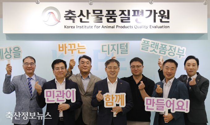 축산물품질평가원(원장 박병홍)은 9월 3일 인공지능과 빅데이터 기술을 활용하여 지속 가능한 축산 유통 환경을 조성하겠다는 의지를 담아 ‘디지털 플랫폼 정부 실천 선포식’을 세종 본원에서 민간업체들과 임직원이 함께 모여 개최했다.