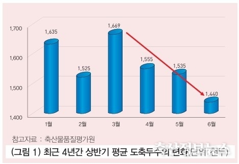 앞서 (그림 1)에서 매월 도축두수를 확인했다면 (그림 2)는 실제 작업일수를 감안하여 일평균 도축두수를 나타내 보았다. 작업일수를 감안한 일평균 도축두수는 (그림 1)과 다소 차이는 보였지만, 4~5월을 거치면서 6월의 도축물량 감소 동향은 충분히 확인이 가능할 것이다. 3월 대비 4~5월 일평균 도축두수는 각각 5.7%, 4.6% 감소했고, 3월 대비 6월의 일평균 도축두수는 10.5% 감소했다. 다시 말하면 공급량의 감소(도축두수의 감소)가 고돈가 시기를 이끄는 주요인일지 모른다.