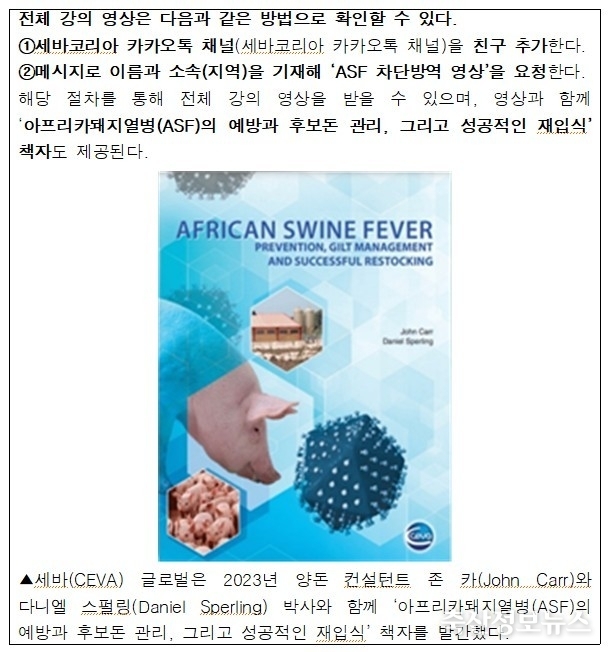 글로벌 백신 전문 동물용의약품 회사 세바(세바코리아)는 2026년 새해를 맞아 다니엘 스펄링 박사(체코 브르노 수의과학대학 교수)가 강연한 유럽 아프리카돼지열병(ASF) 차단방역 전략 영상을 한국어 자막과 함께 공개한다. 이번 영상은 ASF에 대한 유럽의 실제 대응 경험을 바탕으로, 사후 대처가 아닌 사전 차단과 배치관리를 통한 내부 방역 강화의 중요성을 전달한다.