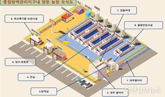 ①외부 울타리 : 사람, 차량, 동물 등의 출입을 통제할 수 있는 외부 울타리 또는 담장을 설치하되, 출입문을 통해서만 방역 후 출입할 수 있는 구조물로 설치한다.