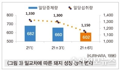 봄철 환절기는 하루에 봄, 여름, 가을 겨울 4계절이 모두 공존하는 시기라고 할 수 있다. 이 시기 돼지의 경우 낮에는 높은 기온으로 인해 체내 열을 발산하고 밤에는 추운 날씨로 체온을 유지한다. 이렇게 큰 일교차가 발생할 때 돼지의 성장 능력이 감소할 수 있다.