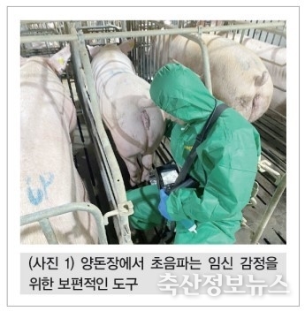 초음파장비가 보급되면서 실시간 임신 감정을 통해 번식효율을 높일 수 있게 되었다(사진 1). 양돈산업은 여기에서 그치지 않고 난소의 상태를 파악하여 교배 적기를 평가하고, 이를 명확하게 하여 번식효율을 극대화하기 위한 많은 실험을 하고 있다. 특히 이러한 연구에서 난소 낭종의 유무와 이에 의한 수태율과의 상관관계 등을 평가하며, 임신진단의 정확도를 높이며 현재보다 조기에 임신 감정이 가능한지도 연구하고 있다.