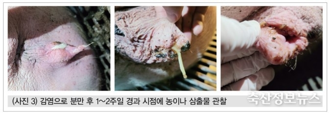 양돈장에서 자궁내막염은 흔하게 발생하는 질환으로 주요 임상증상은 외음부에서 농의 형태로 관찰된다. 이는 대장균, 연쇄상구균, 포도상구균 등의 상행 감염으로 발생한다. 이외에 유방염, 자궁염, 무유증은 분만 후 12시간에서 3일 사이에 주로 관찰된다. 이것들의 원인은 유선이나 비뇨 생식기에 세균감염 때문이며 이로 인해 자돈 폐사율 증가와 이유체중 감소를 유발한다. 이를 컨트롤 하기 위해서는 분만 전·후 위생적 관리가 필요하며 모돈의 체형관리, 운동, 미끄럽지 않은 바닥, 충분한 음수량이 요구된다(사진 3).