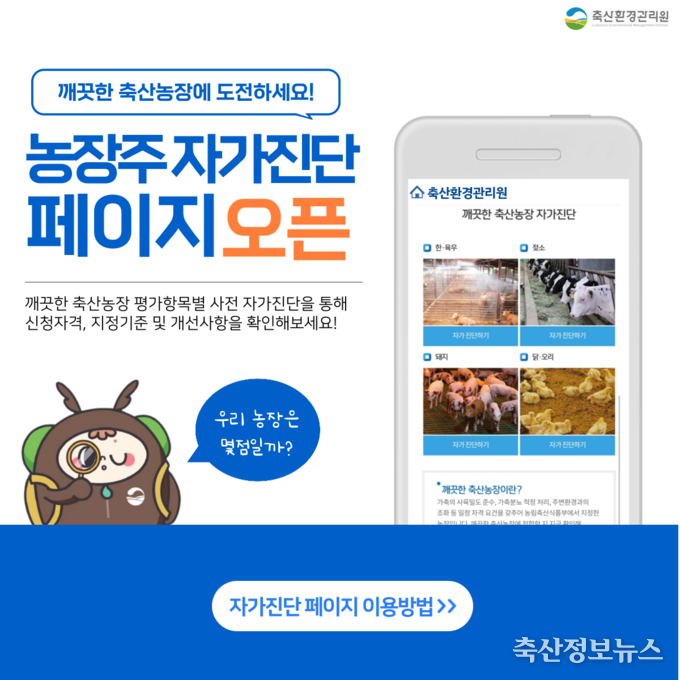 축산환경관리원(원장 이영희)은 축산농가에서 직접 깨끗한 축산농장 신청자격, 지정기준 등을 확인할 수 있는 ‘깨끗한 축산농장 자가진단 페이지’를 5월 26일 개설했다고 밝혔다.