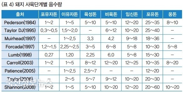 (표 4)를 참조하여 돼지 단계별 음수량을 확인해 보기 바란다. (표 4)를 보면 출처에 따라서 사육단계별 물 요구량이 다른 것을 알 수 있다. 그만큼 물 요구량이 여러 요소에 의해 결정되고 다양하다는 것을 알 수 있다. 최근에는 다산종의 영향인지 포유모돈에서 요구량이 많아지고 있는 것 같다.